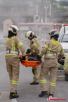 Währenddessen ereignete sich auf der Gerlosstraße, direkt neben dem Übungsobjekt, ein simulierter Verkehrsunfall mit eingeklemmten Personen. Ursache: Ablenkung durch Rauchentwicklung und